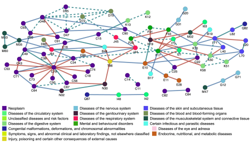 Abstract: Humans present sex-driven biological differences. Consequently, the prevalence of analyzing specific diseases and comorbidities differs between the sexes, directly impacting patients’ management and treatment. Despite its relevance and the growing evidence of said differences across numerous diseases (with 4,370 PubMed results published within the past year), knowledge at the comorbidity level remains limited. In fact, to date, no study has attempted to identify the biological processes altered differently in women and men, promoting differences in comorbidities. To shed light on this problem, we analyze expression data for more than 100 diseases from public repositories, analyzing each sex independently. We calculate similarities between differential expression profiles by disease pairs and find that 13-16% of transcriptomically similar disease pairs are sex-specific. By comparing these results with epidemiological evidence, we recapitulate 53-60% of known comorbidities distinctly described for men and women, finding sex-specific transcriptomic similarities between sex-specific comorbid diseases. The analysis of shared underlying pathways shows that diseases can co-occur in men and women by altering alternative biological processes. Finally, we identify different drugs differentially associated with comorbid diseases depending on patients’ sex, highlighting the need to consider this relevant variable in the administration of drugs due to their possible influence on comorbidities.